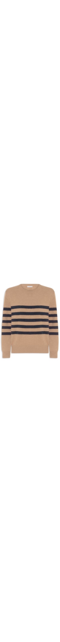 O suéter marrom é confeccionado em tricot com média elasticidade. A peça solta ao corpo possui decote arredonado, mangas longas com punhos ajustados, barra com efeito canelado e padronagem listrada em cor contrastante.