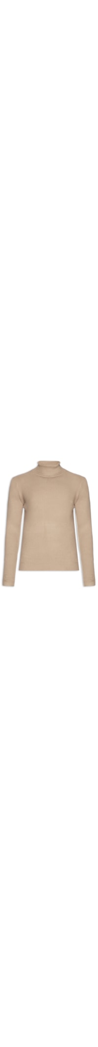O suéter bege é confeccionado em tricot com alta elasticidade. A peça possui gola alta, mangas longas e acabamento canelado.