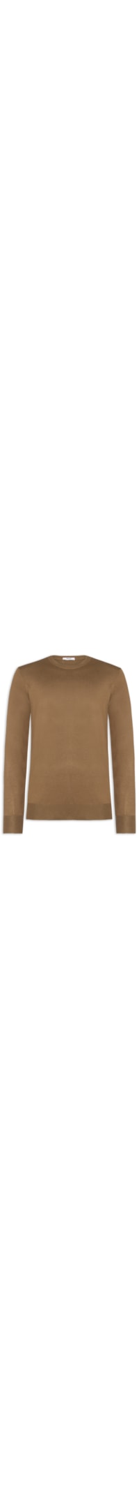O suéter marrom é confeccionado em tricot com alta elasticidade. A peça solta ao corpo possui gola careca e mangas longas ajustadas.