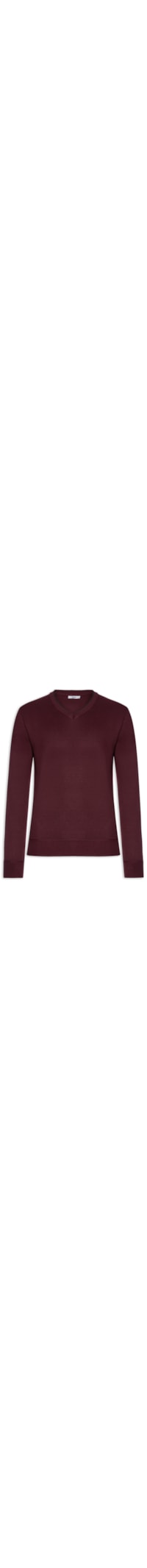 O suéter vinho é confeccionado em tricot com média elasticidade. A peça solta ao corpo possui gola V, mangas longas e detalhes em vivo na cor preta.