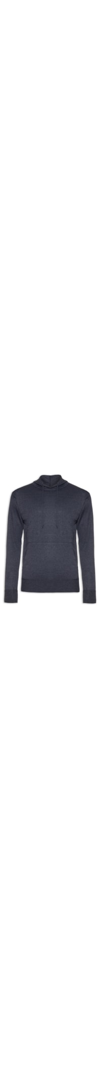 O suéter azul é confeccionado em tricot encorpado. A peça possui capuz com cordão para ajuste, mangas longas, bolso frontal modelo canguru, shape solto, caimento reto e acabamento canelado.