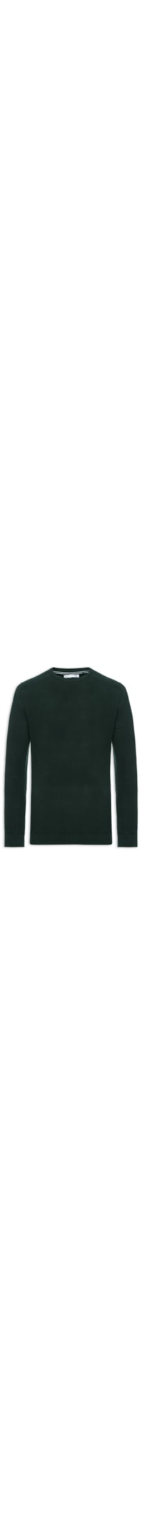 O suéter verde é confeccionado em tricot com superfície texturizada e média elasticidade. A peça solta ao corpo possui gola redonda, mangas longas e acabamento canelado.