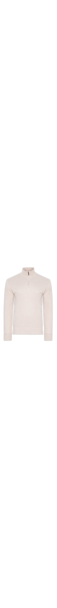 O suéter bege é confeccionado em tricot com alta elasticidade. A peça solta ao corpo possui gola alta com fechamento por zíper, mangas longas e acabamento canelado.