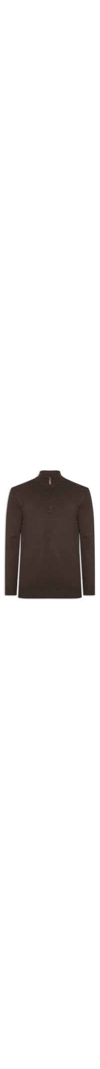 O suéter marrom é confeccionada em tricot com baixa elasticidade. A peça solta ao corpo possui gola alta com ajuste por zíper, mangas longas e acabamento canelado nos punhos e barra.