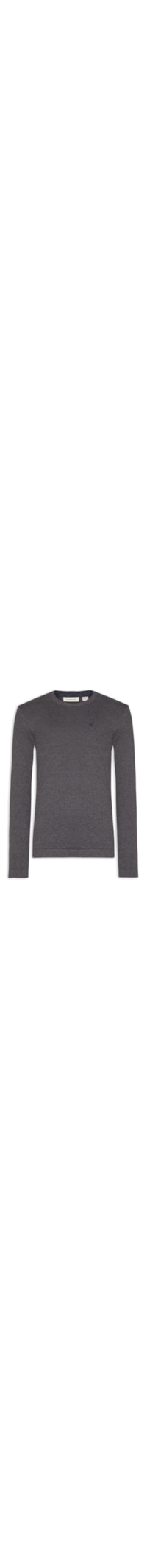 O suéter cinza é confeccionado em tricot com alta elasticidade. A peça solta ao corpo possui gola careca com acabamento canelado, mangas longas e logo da marca bordado na cor azul marinho na altura do tórax.