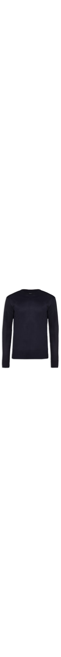 O suéter azul marinho é confeccionado em malha. A peça solta ao corpo possuo gola careca com acabamento canelado e mangas longas.