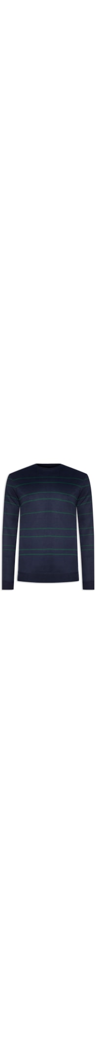 O suéter azul marinho é confeccionado em tricot com alta elasticidade. A peça solta ao corpo possui gola careca, mangas longas com ajuste nos punhos e padronagem listrada na cor verde.