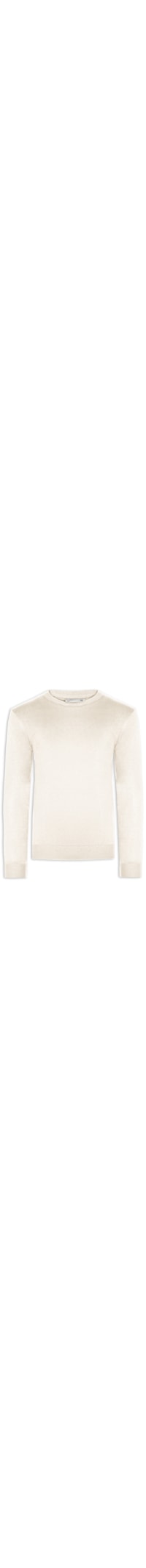 O suéter bege é confeccionado em tricot com alta elasticidade. A peça solta ao corpo possui gola arredondada, mangas longas e acabamentocanelado.