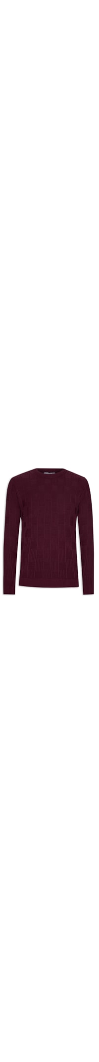 O suéter vinho é confeccionado em tricot com superfície texturizada e alta elasticidade. A peça solta ao corpo possui gola careca e mangas longas com ajuste nos punhos.