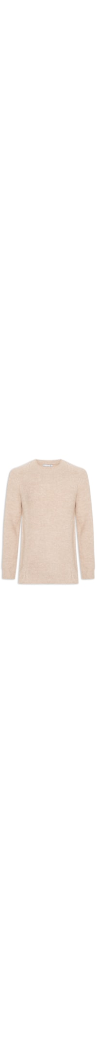 O suéter bege é confeccionado em tricot com superfície canelada e alta elasticidade. A peça justa ao corpo possui gola arredondada, mangas longas e acabamento canelado.