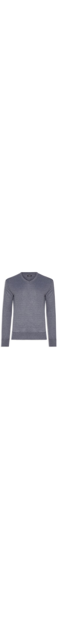 O suéter cinza é confeccionado em tricot com baixa elasticidade. A peça solta ao corpo possui gola V, mangas longas com ajuste nos punhos, efeito de mescla e acabamento canelado na gola, barra e nos punhos.