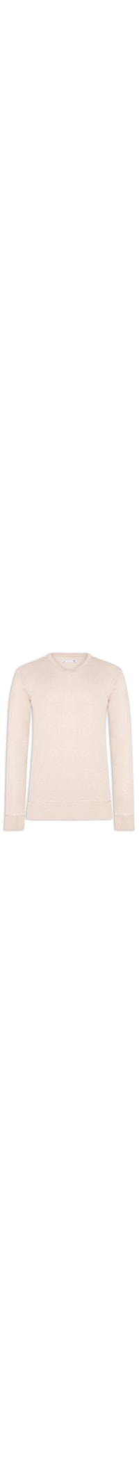 O suéter bege é confeccionado em tricot com alta elasticidade. A peça solta ao corpo possui gola V, mangas longas e acabamento canelado na gola, punhos e barra.