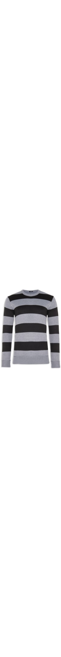 O suéter cinza é confeccionado em malha. A peça possui gola redonda, mangas longas, padronagem de listras em cor contrastante, shape justo, caimento reto e acabamento canelado.