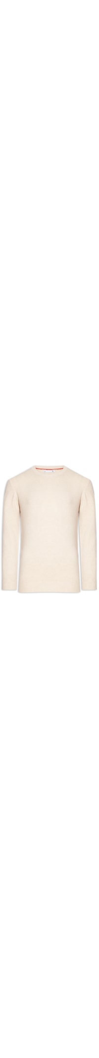 O suéter bege é confeccionado em tricot com alta elasticidade. A peça solta ao corpo possui gola redonda, mangas longas e gola, punho e barras com acabamento canelado.
