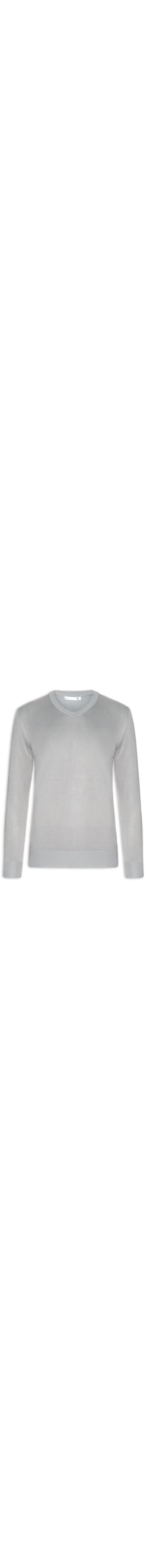 O suéter cinza é confeccionado em tricot com alta elasticidade. A peça solta ao corpo possui gola V e mangas longas com ajuste nos punhos.