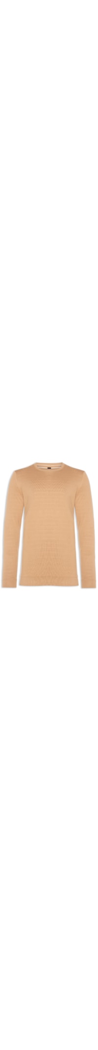 O suéter marrom é confeccionado em tricot de média elasticidade. A peça solta ao corpo de modelo dupla face possui gola redonda, mangas longas e acabamento canelado. A outra face possui padronagem listrada em cor contrastante.