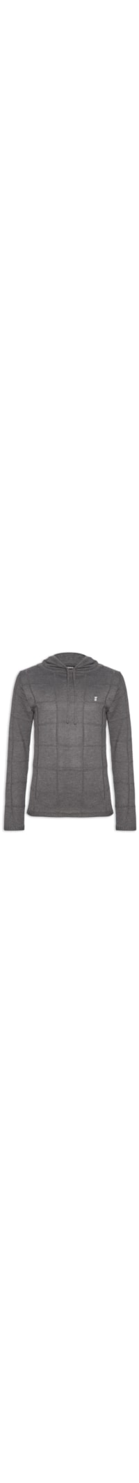 O suéter cinza é confeccionado em tricot de baixa elasticidade. A peça solta ao corpo, possui capuz com cordões embutidos, angas longas, logo da marca bordado na altura do tórax em cor contrastante, padronagem quadriculada em baixo-relevo e acabamento canelado.