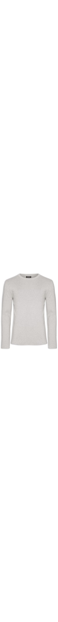 O suéter cinza é confeccionado em tricot com alta elasticidade. A peça solta ao corpo possui gola careca com acabamento canelado e mangas longas.