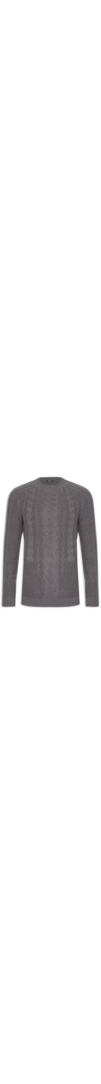 O suéter cinza é confeccionado em tricot de média elasticidade. A peça solta ao corpo, possui gola redonda, mangas longas, padronagem com detalhes trançados e acabamento canelado.