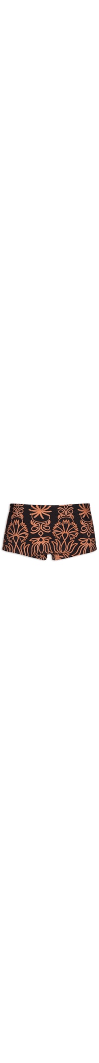 A sunga preta é confeccionada em malha de poliamida com baixa elasticidade. A peça possui cós com cordão embutido na parte interna para ajuste, logo da marca bordado na parte frontal, forro e estampa abstrata em cor contrastante.