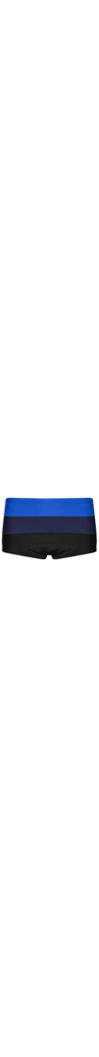 A sunga azul é confeccionada em malha de poliamida com baixa elasticidade. A peça possui cós com cordão embutido na parte interna para ajuste, recorte em cor contrastante, logo da marca bordado na parte frontal e forro.