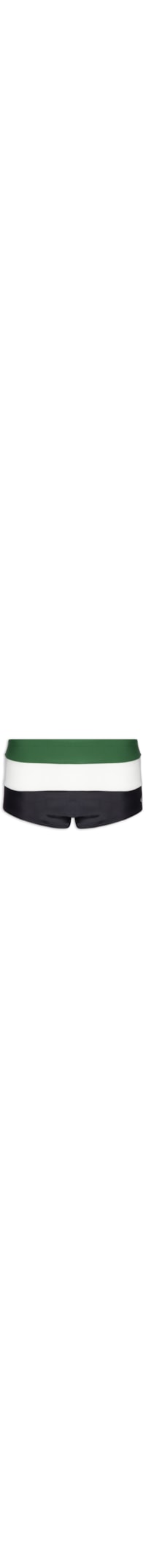 A sunga verde é confeccionada em malha de poliamida com média elasticidade. A peça possui cintura baixa, cós com elástico e cordão embutido para ajuste e amarração interna, recortes de listras em cores contrastantes, bordado frontal com logo da marca e forro.