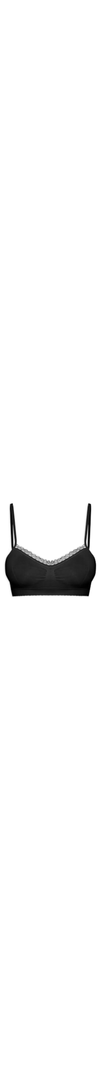 O sutiã preto é confeccionado em malha com alta elasticidade. A peça possui decote U com renda aplicada, alças finas, sem bojo, pences frontais e padronagem geométrica bordada na parte posterior com detalhe de recortes vazados.