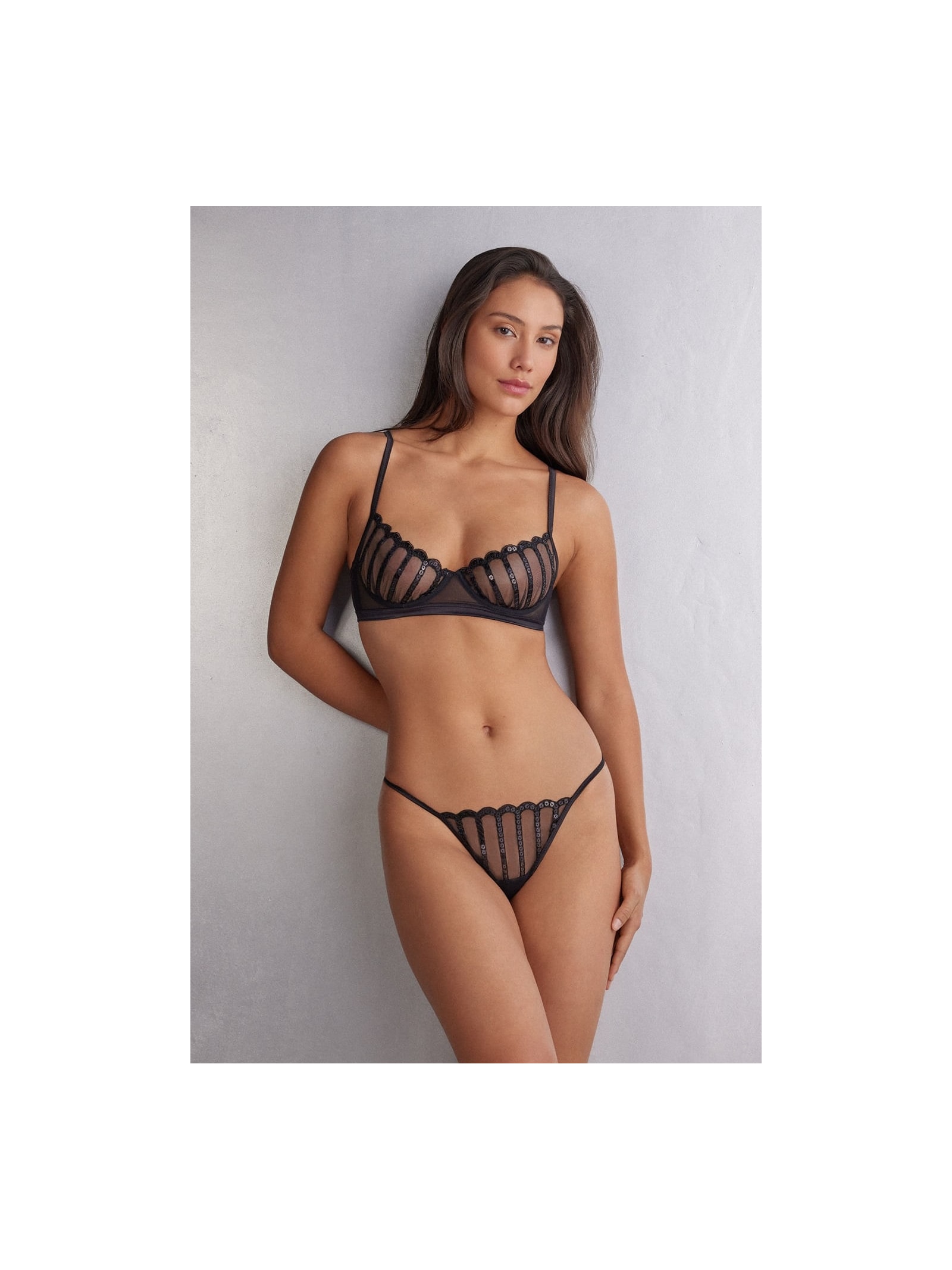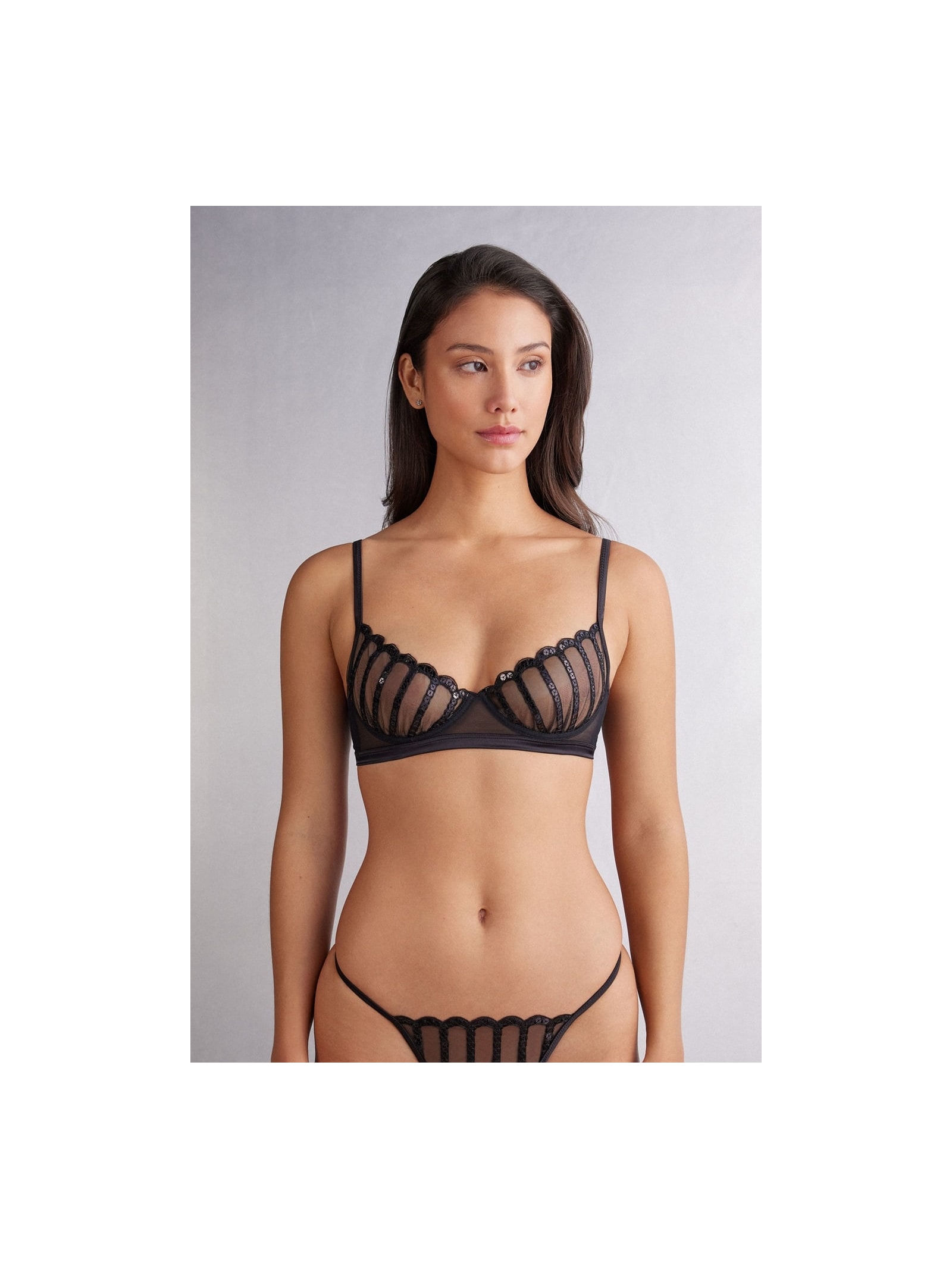 Sutiã balconette em tule macio com bordado de paetês nas copas, proporcionando um efeito brilhante e elegante. Acabamentos em cetim.