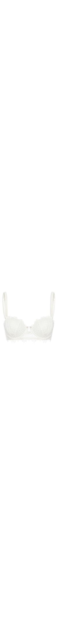 O sutiã branco é confeccionado por renda com alta elasticidade. A peça possui decote meia taça, alças finas com ajuste, bojo embutido, forro, tag da marca metalizada aplicada na barra e fechamento posterior por colchete.