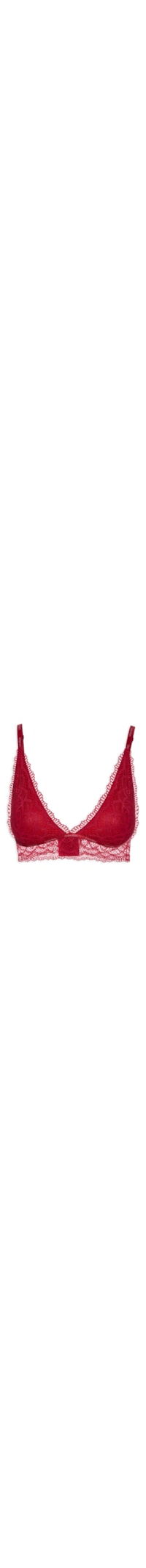 O sutiã vermelho é confeccionado em renda floral com alta elasticidade. A peça justa ao corpo de modelo triângulo possui transparência, alças finas reguláveis, elástico aplicado abaixo do busto com nome da marca e fechamento posterior por colchete.