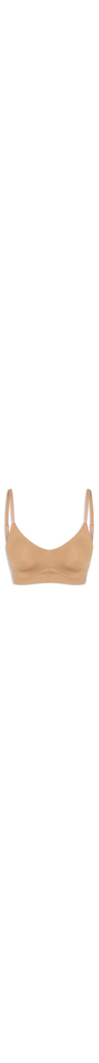 O sutiã bege é confeccionado em malha leve com média elasticidade. A peça possui decote em V suave com costura central frontal, sem bojo, alças finas ajustáveis, caimento justo ao corpo, barra inferior reta e fechamento poaterior por extensor com colchetes.