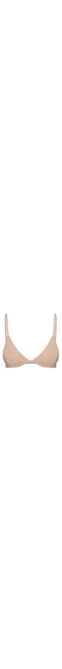 O sutiã bege é confeccionado em malha de poliamida com média elasticidade. A peça possui decote V, alças finas reguláveis, aro embutido abaixo do busto, tecido duplo, sem bojo e fechamento posterior por colchetes.
