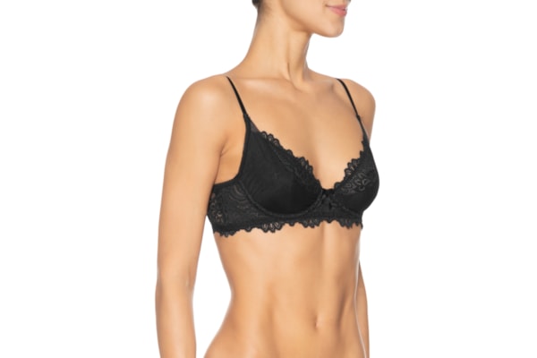 O sutiã preto é confeccionado por renda com média elasticidade. A peça possui decote meia taça, alças finas com ajuste, aro embutido na parte inferior do busto, alta transparência, tag da marca metalizada aplicada na barra e fechamento posterior por colchete.
