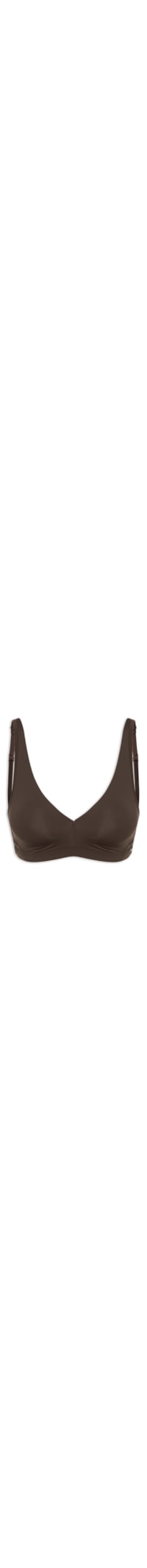 O sutiã marrom é confeccionado em malha leve com média elasticidade. A peça possui decote em V profundo com costura central frontal, sem bojo, alças médias ajustáveis com parte posterior adaptável, caimento justo ao corpo, barra inferior reta e fechamento posterior por extensor com colchetes.