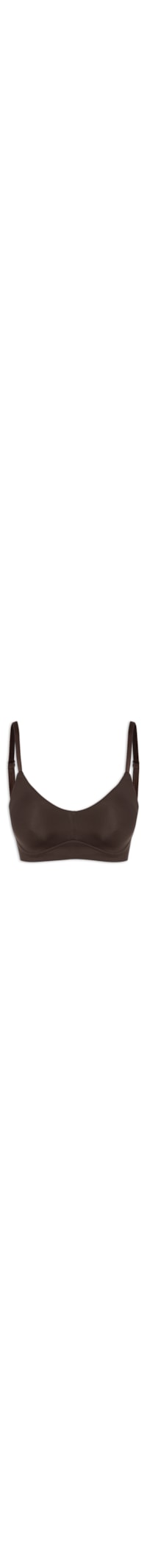 O sutiã marrom é confeccionado em malha leve com média elasticidade. A peça possui decote em V suave com costura central frontal, sem bojo, alças finas ajustáveis, caimento justo ao corpo, barra inferior reta e fechamento poaterior por extensor com colchetes.