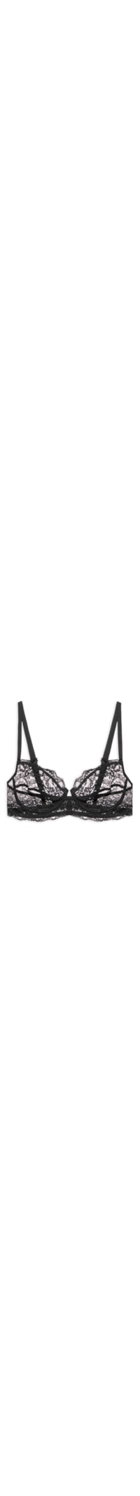 O sutiã preto é confeccionado em renda com média elasticidade. A peça justa ao corpo possui decote V, alças finas reguláveis, aros embutidos para sustentação, forro em tule, transparência e fechamento posterior por colchetes.