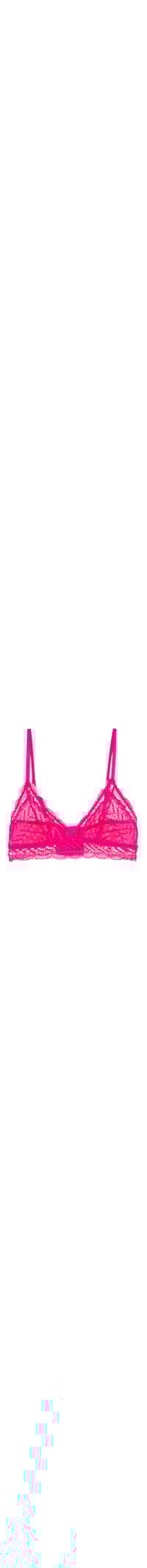 O sutiã rosa é confeccionado em renda. A peça possui decote V, alças finas reguláveis, cavas regulares, parte posterior em tule com logo metalizado da marca aplicado, meio forro, detalhe de transparência, shape justo, caimento reto, acabamento pespontado e fechamento posterior por colchetes.