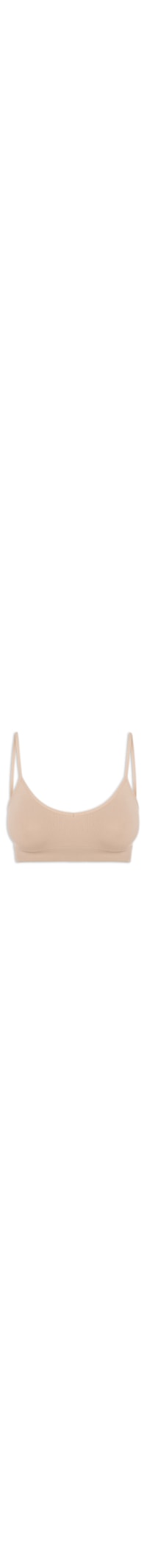 O sutiã bege é confeccionado em malha com alta elasticidade. A peça possui decote V, alças finas, cavas regulares, nome da marca estampado em cor contrastante na parte posterior e sem bojo.