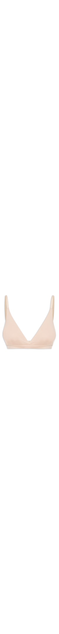 O sutiã bege é confeccionado em malha de poliamida com alta elasticidade. A peça possui decote V profundo com detalhe transpassado, alças finas com regulagem, cavas regulares, laterais médias, bojo removível, elástico embutido na barra e fechamento posterior por colchetes.