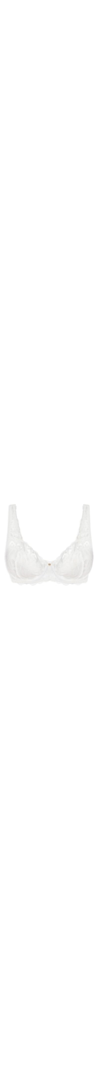 O sutiã branco é confeccionado em renda com média elasticidade. A peça possui decote meia taça, alças finas reguláveis, aro embutido abaixo do busto, padronagem floral com recortes vazados, bojo e fechamento posterior por colchetes.
