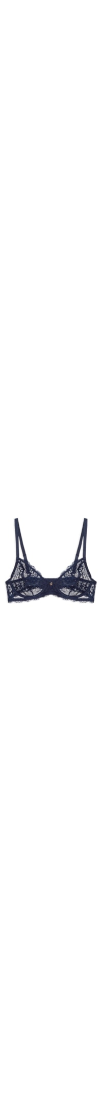 O sutiã azul é confeccionado em renda. A peça de modelo meia taça possui alças finas ajustáveis, aro de sustentação, tag metálica da marca aplicada na parte frontal, leve transparência, acabamento pespontado e fechamento posterior por colchetes.
