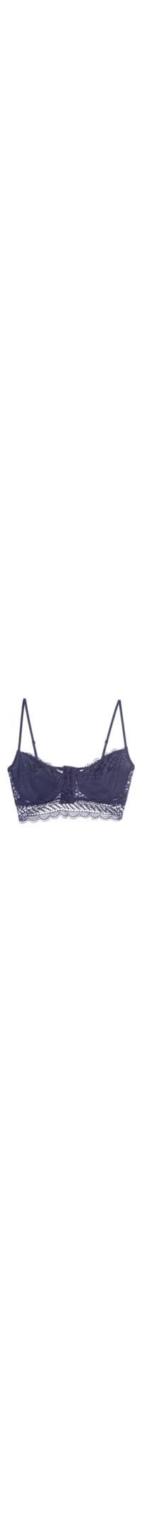 O sutiã azul marinho é confeccionado em renda. A peça possui decote coração, aplicação em V embutida para sustentação, alças finas reguláveis, cavas regulares, logo metalizado da marca aplicado na parte posterior, meio forro, detalhe de transparência, shape justo, caimento reto, acabamento pespontado e fechamento posterior por colchetes.