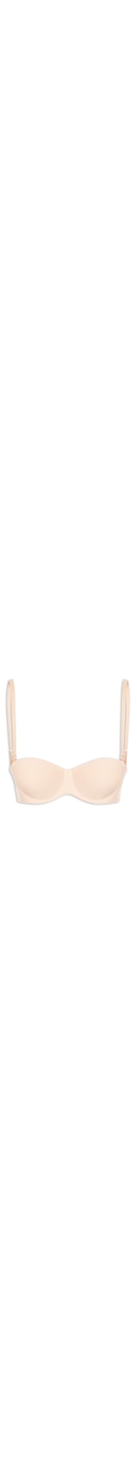 O sutiã bege é confeccionado em malha de poliamida. A peça possui decote meia taça, bojo, aros de sustentação, alças finas reguláveis e removíveis e fechamento posterior por colchetes.