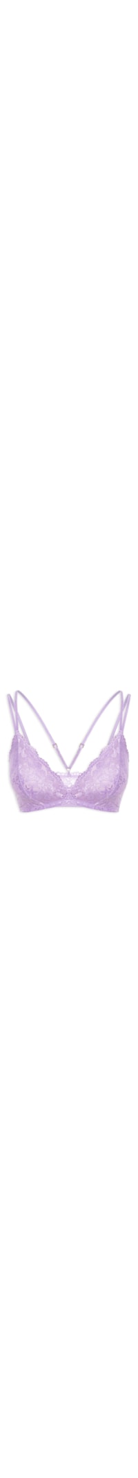 O sutiã lilás é confeccionado em renda com alta elasticidade. A peça possui decote V transpassado, alças finas duplas com regulagem, recortes frontais, laterais médias, forro em tule, sem bojo, transparência e elástico embutido na barra.