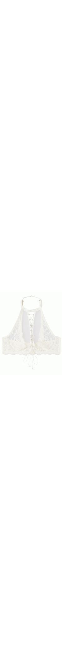 Sutiã top com aros e tiras laterais, feito em renda e tule elásticos. Destaca-se pelo detalhe cruzado de tiras, decorado por pequenos berloques dourados, causando um efeito sensual à peça. Acabamentos em cetim e um laço especial atrás do pescoço. Alças elásticas, ajustáveis e removíveis.