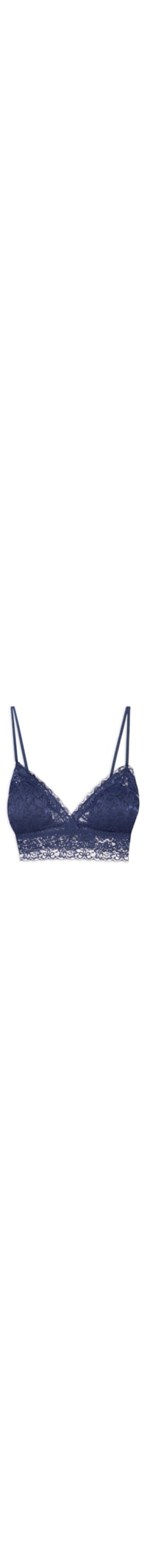 O sutiã azul é confeccionado em renda com alta elasticidade. A peça de modelo triângulo possui decote V, alças finas reguláveis, forro em tule na altura do busto, leve transparência, bojo removível, tag da marca aplicada na parte posterior e acabamento elástico.