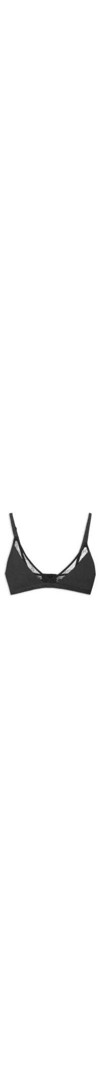 O sutiã preto é confeccionado em malha com alta elasticidade. A peça justa ao corpo de modelo triângulo possui decote V, alças finas com regulagem, sem bojo, laterais médias, recorte posterior e frontal em renda com transparência e fechamento posterior por colchetes.