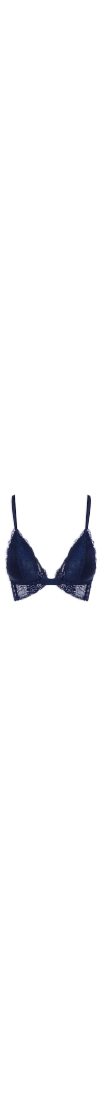 O sutiã azul marinho é confeccionado em renda. A peça de modelo triangulo possui decote V, alças finas reguláveis, bojo removível, forro, detalhe de transparência, shape justo, acabamento elástico e fechamento posterior por colchetes.