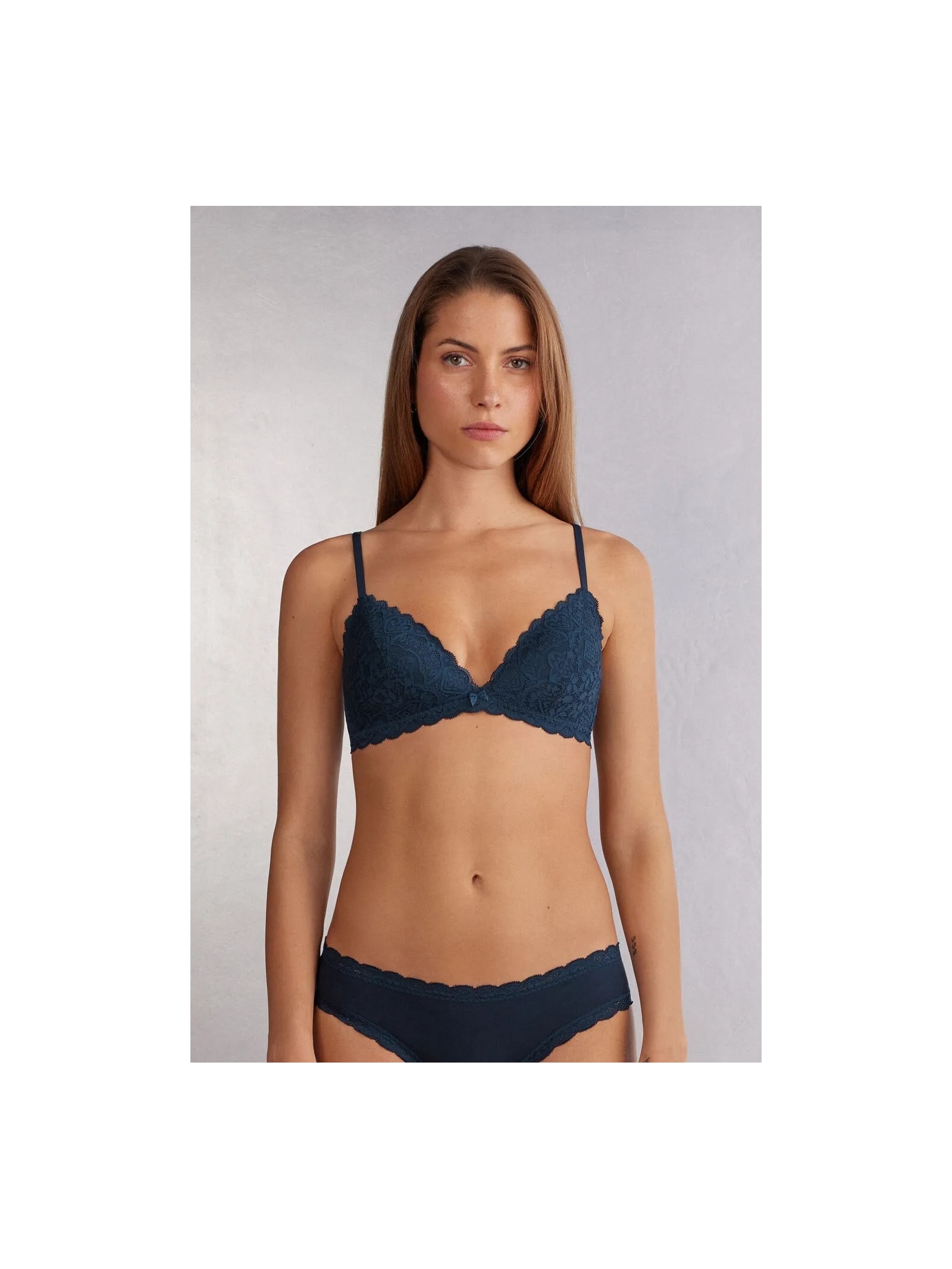 Sutiã triângulo Tiziana em renda macia e elástica. Modelo ideal para quem busca um sutiã com bojo e um efeito natural.