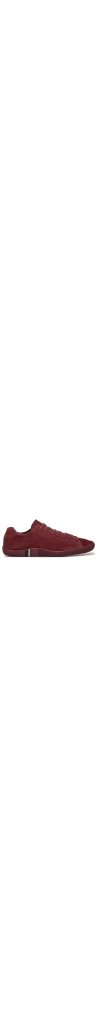 O tênis vermelho é produzido em camurça. A peça possui bico arredondado, cabedal com acabamento acamurçado, recortes laterais, logo da marca aplicado na parte posterior, palmilha com aplicação de logo, entressola com detalhe em listra em cor contrastante, solado emborrachado com frisos e fechamento superior por cadarço.